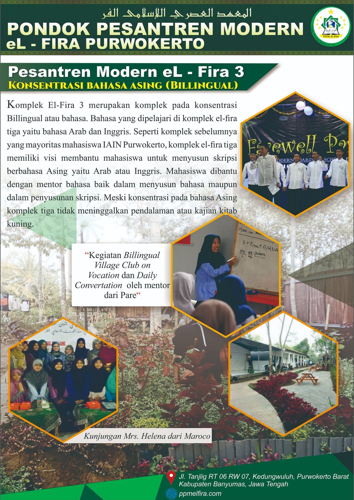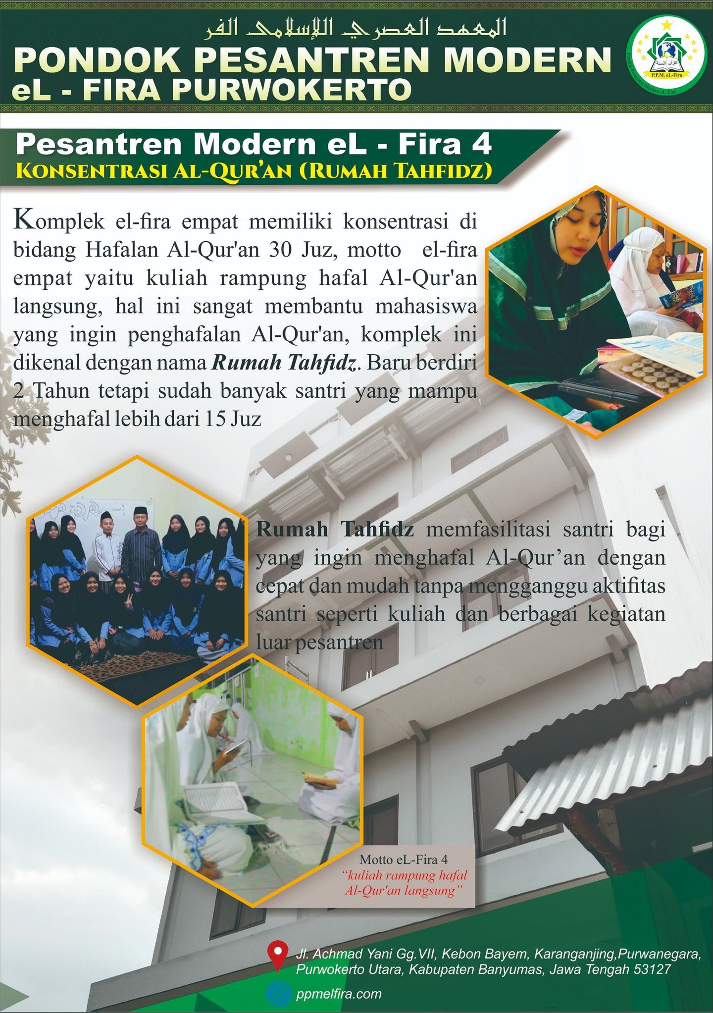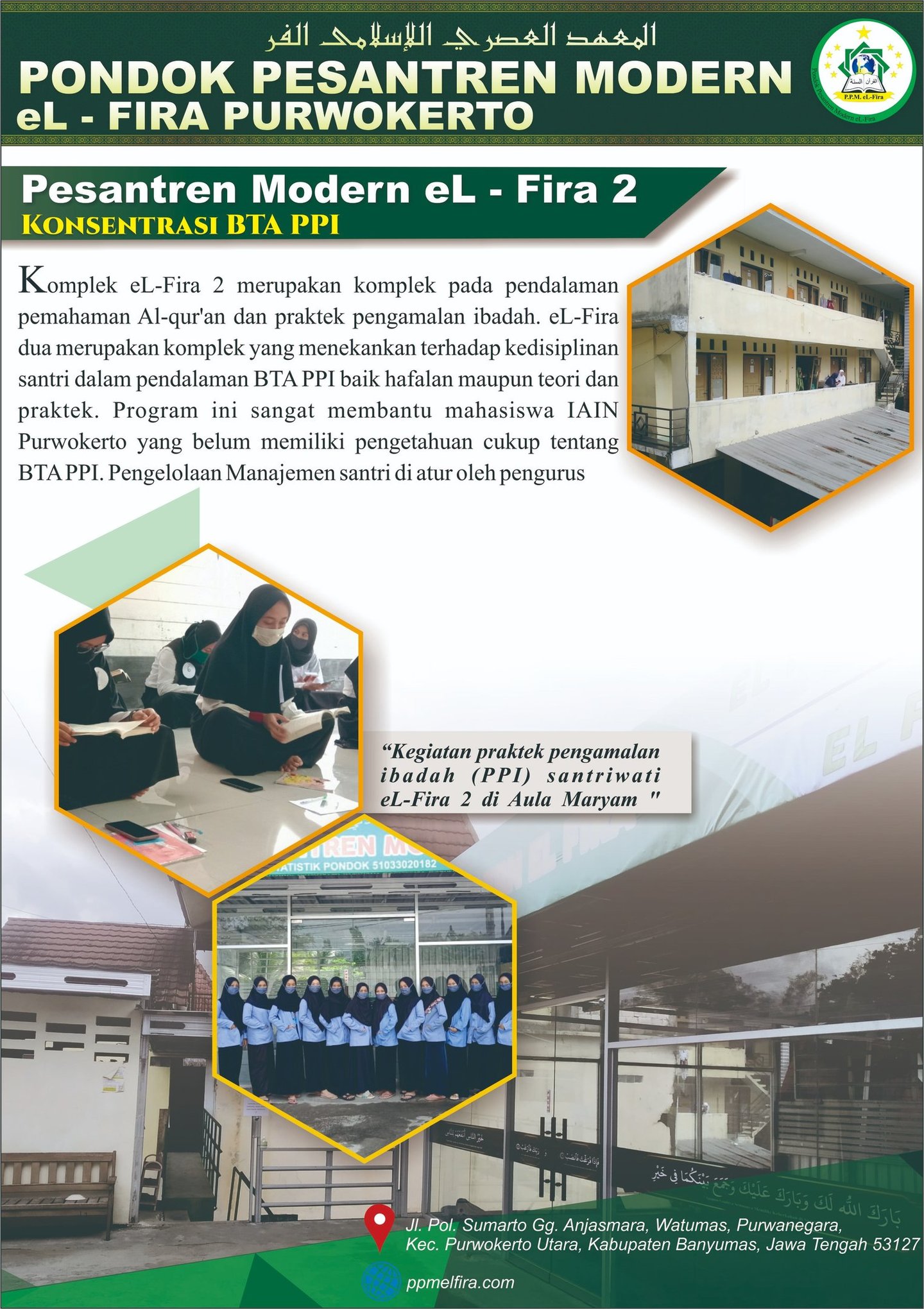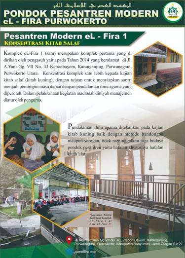 Pondok Pesantren Modern El-Fira yang berlokasi di Jl. Ahmad Yani Gg. VII No. 43 Kebonbayem, Karanganjing, Purwanegara, Purwokerto Utara, yang terletak tidak jauh dari perguruan tinggi UIN SAIZU Purwokerto. Pondok ini adalah cabang dari Yayasan Nurjalin Cilacap, yang fokus mendidik para santri dalam pengembangan ilmu-ilmu agama (tafaqquh fiddin) yang mengkhaskan dirinya dengan pondok modern. Dengan landasan kerangka berfikir المحُاَفَظَةُ عَلَى القَدِيْمِ الصَالِحِ وَالأَخْذُ باِلجَدِيْدِ الأَصْلَحِ tetap menjaga tradisi pesantren (kajian kitab-kitab Kuning) dan mengambil yang sesuatu yang baru (Modern) dengan pertimbangan mengandung nilai positif, lebih baik, yang dalam hal ini adalah penguasaan dalam Billingual (dua bahasa) Arab-Inggris.